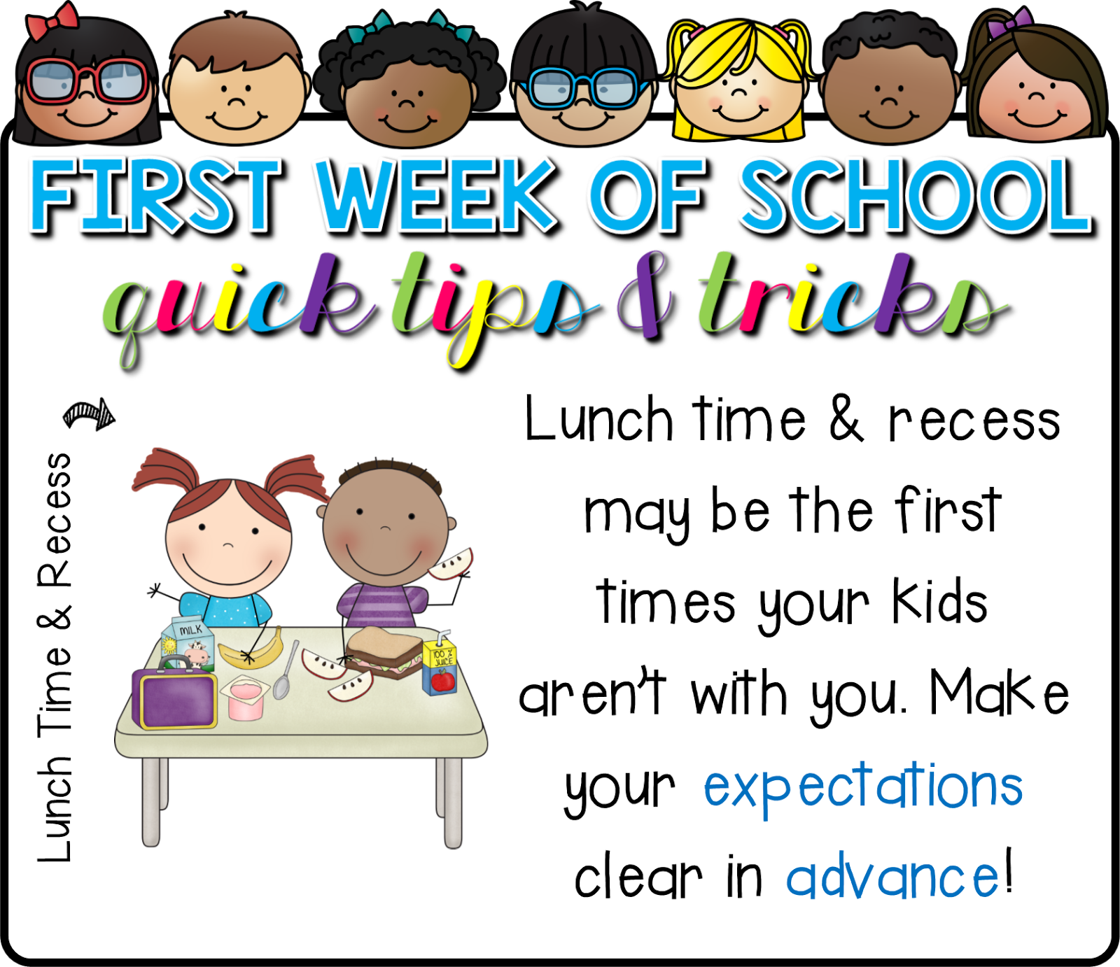 Whether your students go to lunch/recess with or without you make sure to discuss appropriate recess and lunchroom behavior them. We practice lining up, we talk about making friends and including friends, how to be respectful of the school’s property and other staff members, and being role-models. Something I stress to my students all year long, is that they should be their best self even if I’m not there to see it. They should strive to be better because THEY want to be better, not because I told them to.