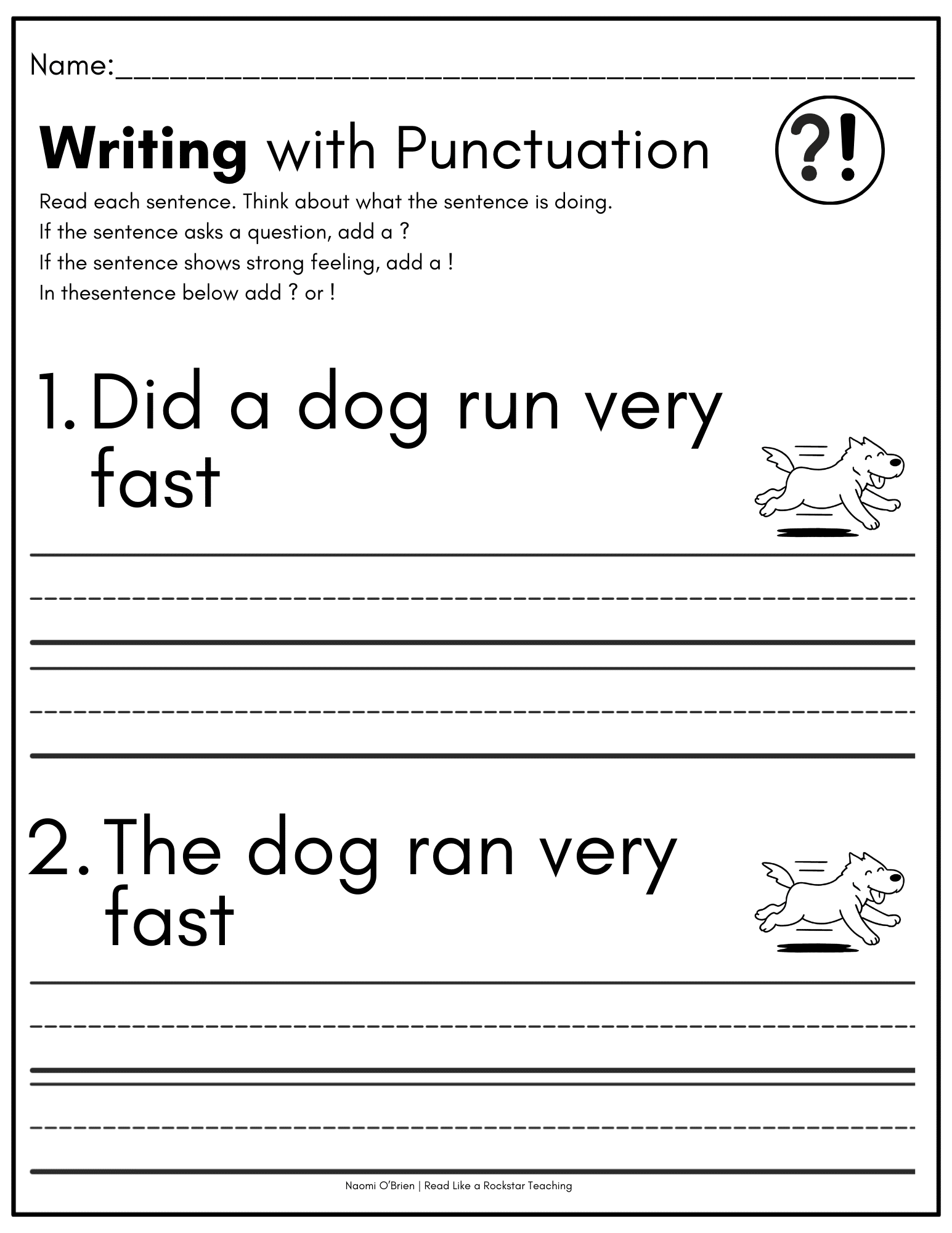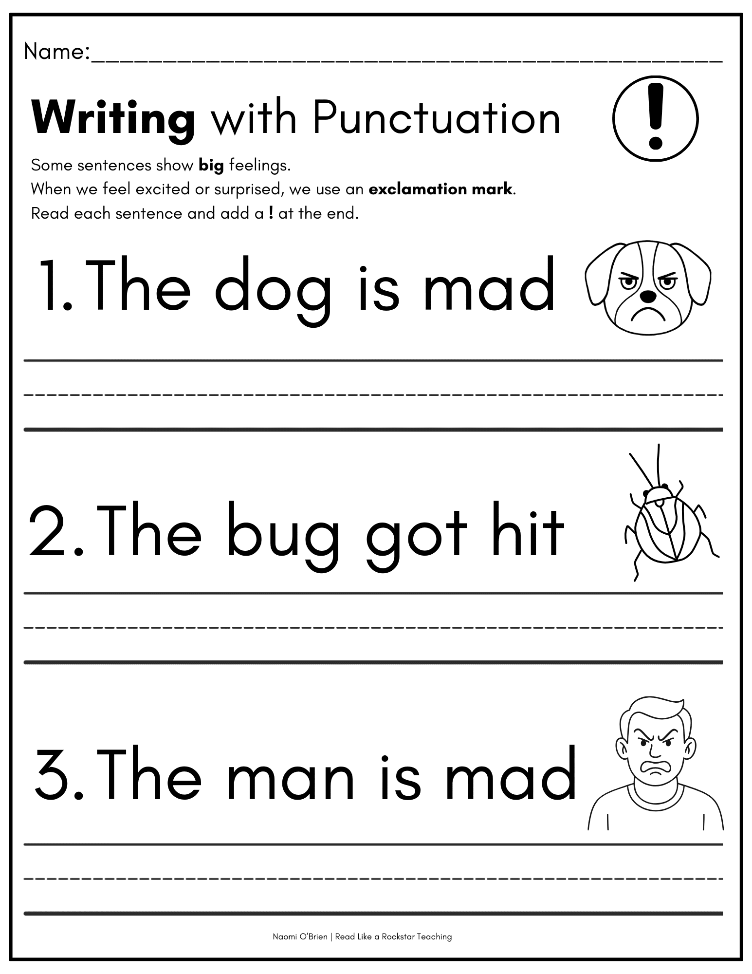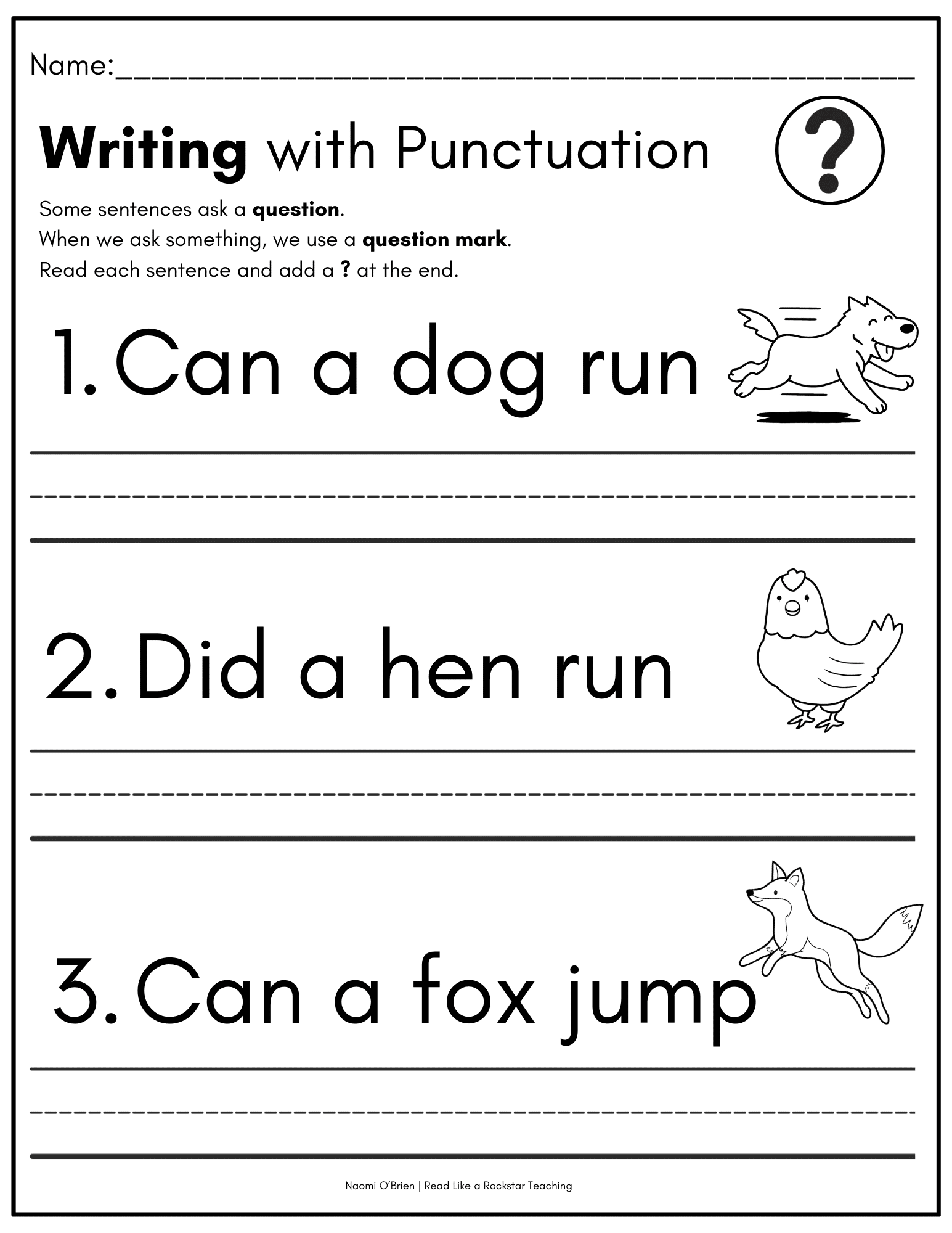 These 21 pages include short, decodable sentences that require students to choose between a question mark (?) or an exclamation mark (!) based on meaning. Students learn to think about what the sentence is doing—asking a question or showing strong feeling—before adding the correct ending punctuation.