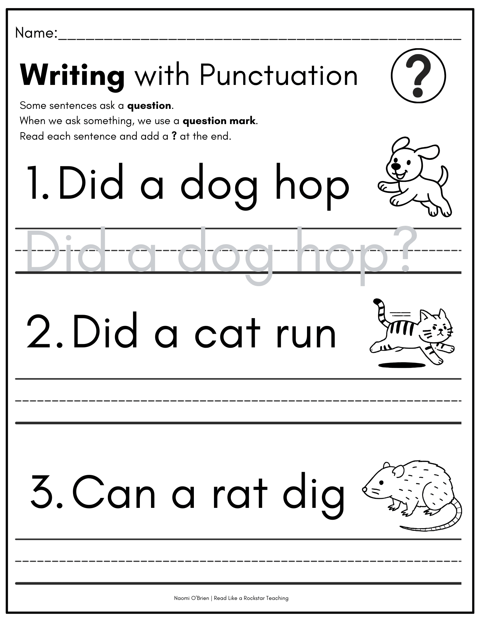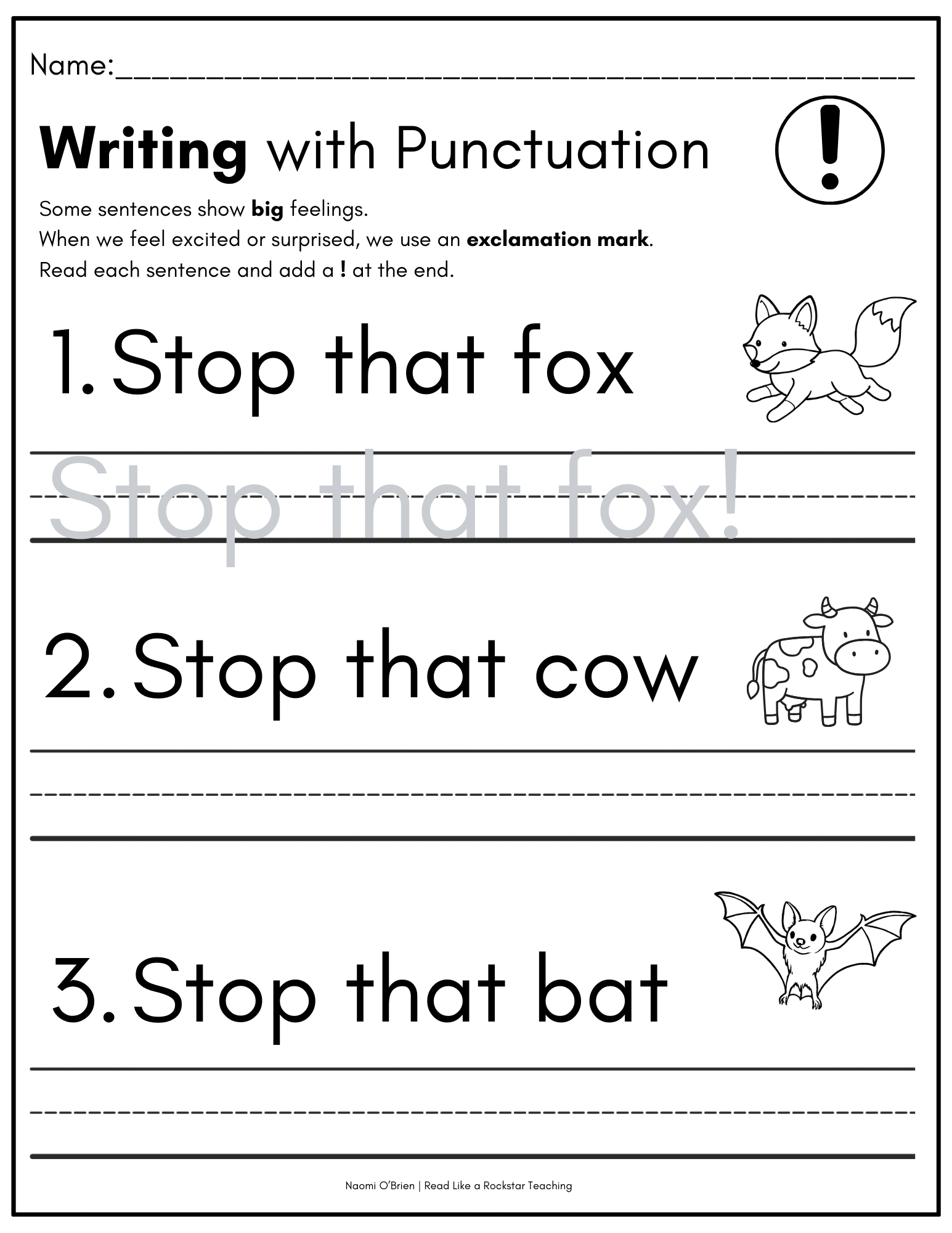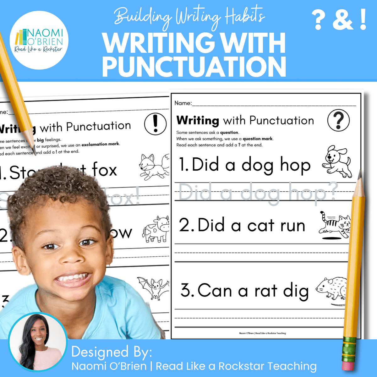 These 21 pages include short, decodable sentences that require students to choose between a question mark (?) or an exclamation mark (!) based on meaning. Students learn to think about what the sentence is doing—asking a question or showing strong feeling—before adding the correct ending punctuation.