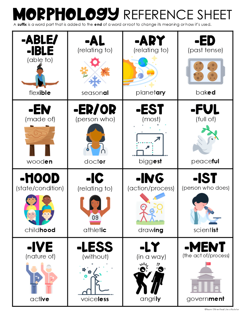 Affixes: able, ible, al, ary, ed, en, er, or, est, ful, hood, ic, ing, ist, ive, less, ly, ment, ness, ology, ous, ship, tion, sion, ward, y, s, es
