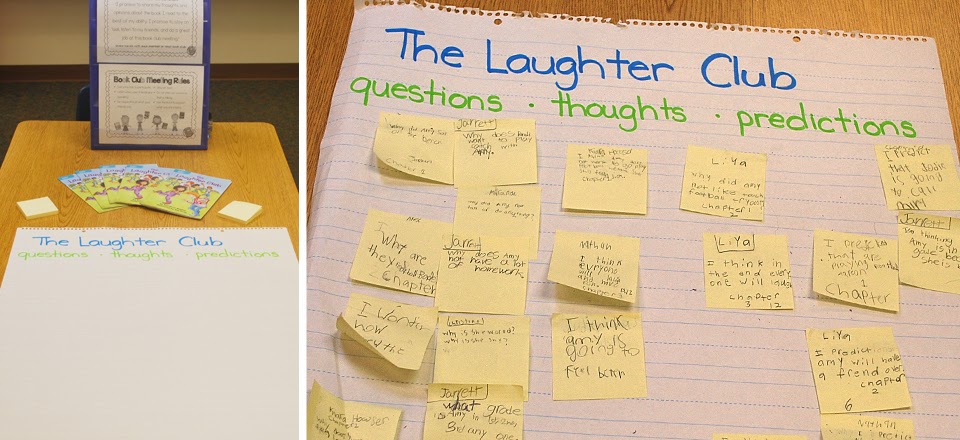 Book clubs are a something my students absolutely love! It’s so fun to see them get together to discuss literature and nonfiction text in this setting. The students always read their book club promise to each other and know that they need to be responsible and helpful to the other book club members. This particular day the students read The Laughter Club and used Post-It notes to jot down their thoughts, questions, and anything that confused them. Sometimes the students just fill out an interactive book journal to help them organize their thinking. I just created a little fold-able booklet that allows them to write down questions, their favorite part, confusing parts, interesting parts, and tricky vocabulary words. After that, they held a discussion about the book. They used some discussion cards I created in order to keep the discussion going. Our book clubs meet once a week. They help promote independence and a deeper comprehension of the text in a fun way! Keep rocking!